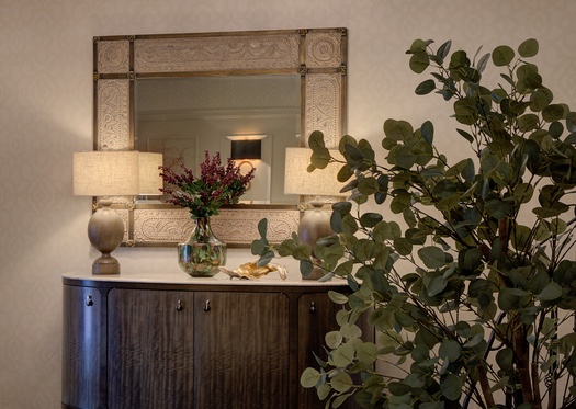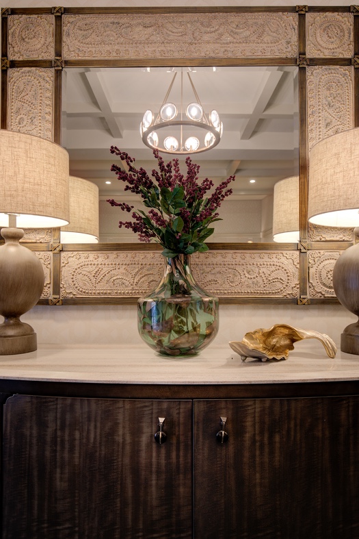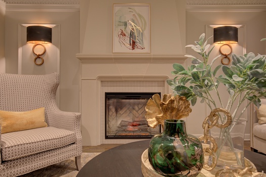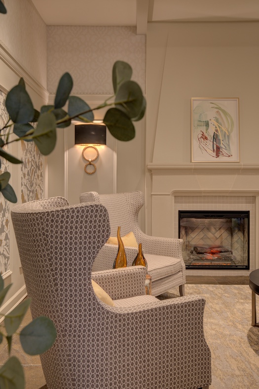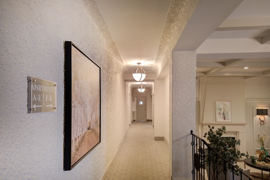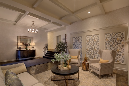History is important to this century old Tudor condominium building in Great Neck. Keeping the traditional look but with a Modern twist — that was the quest. Refacing the wood paneling, adding additional millwork in lighter colors brightened up the walls and ceiling. Textured fabrics, modern lighting and fabricating a cast stone fireplace mantel with a gas insert, enhances the space while keeping tradition alive. The ambiance of this entire Modern Tudor lobby and entry has been elevated in a style befitting this beautiful residence.