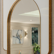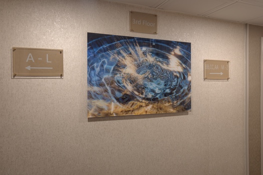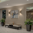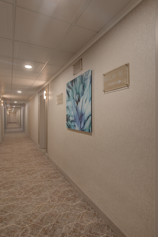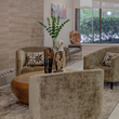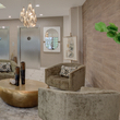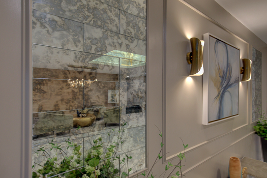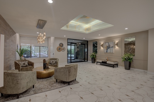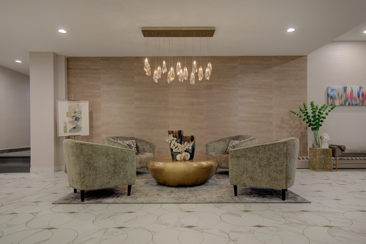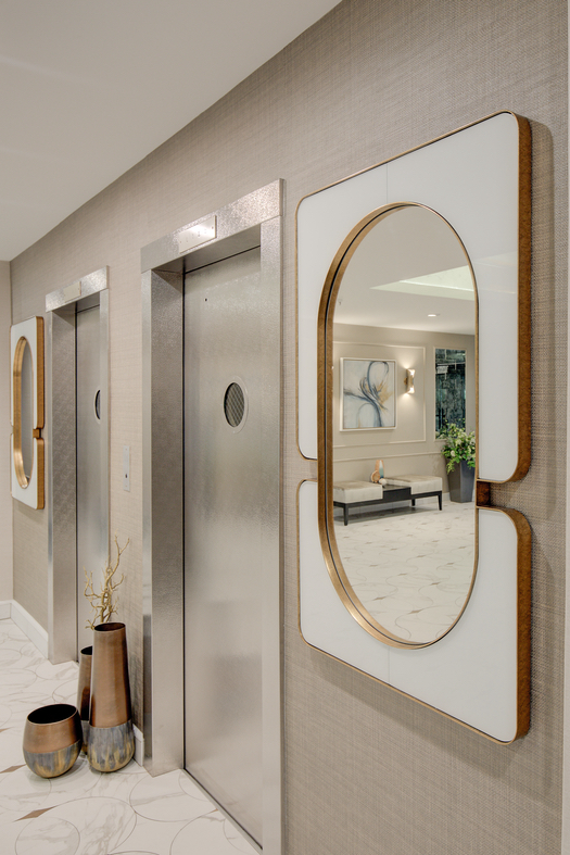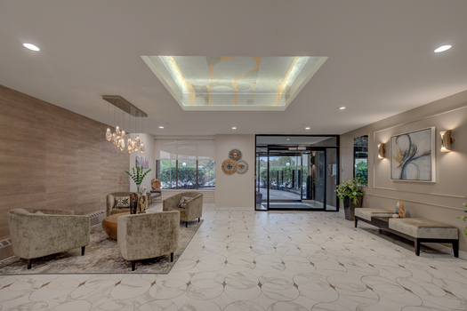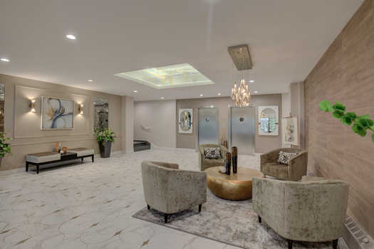 Modern elegance is featured in this distinctive North Shore Condo building. Utilizing a uniquely geometric wall covering as a jumping off point, all fabrics and leathers pulled the gold, silver, copper and taupe coloration into play. Custom porcelain tiles with warm wood inserts continue the theme, as does the sparkling pendant chandelier. Multiple mirror placements and styles, reflect the outside light to give this lobby a distinctive appearance that will shine for years to come.